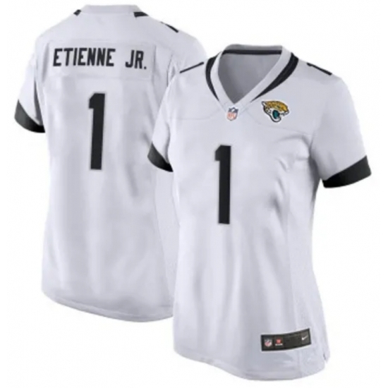 >Women Jacksonville Jaguars #1 Travis Etienne JR White 2024 Prowler Throwback Vapor Limited Stitched Football Jersey