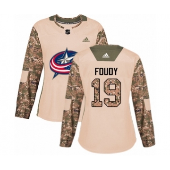 Women's Adidas Columbus Blue Jackets #19 Liam Foudy Authentic Camo Veterans Day Practice NHL Jersey