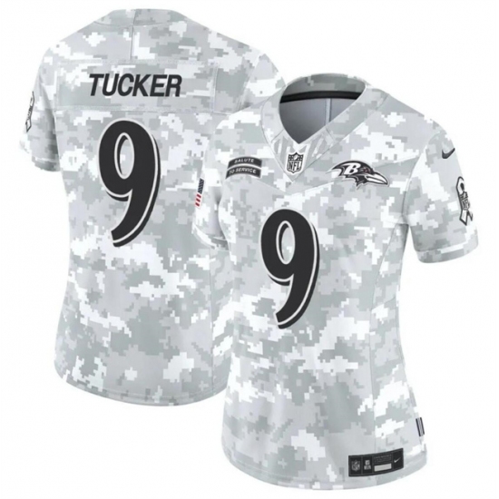 >Women's Baltimore Ravens #9 Justin Tucker 2024 F.U.S.E Arctic Camo Salute To Service Limited Stitched Football Jersey(Run Small)