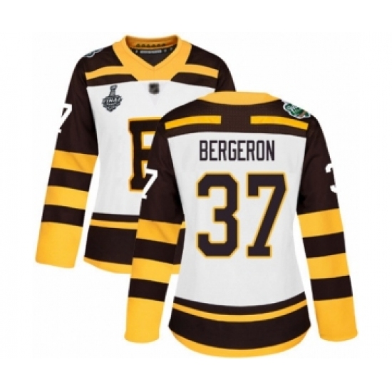 >Women's Boston Bruins #37 Patrice Bergeron Authentic White Winter Classic 2019 Stanley Cup Final Bound Hockey Jersey