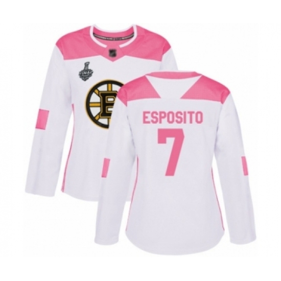 >Women's Boston Bruins #7 Phil Esposito Authentic White Pink Fashion 2019 Stanley Cup Final Bound Hockey Jersey