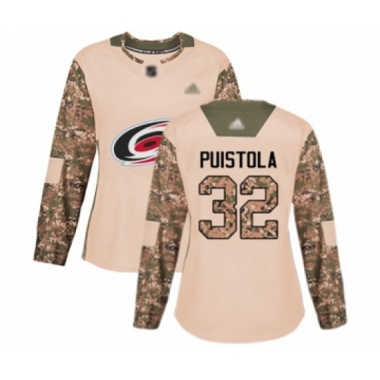 >Women's Carolina Hurricanes #32 Patrik Puistola Authentic Camo Veterans Day Practice Hockey Jersey