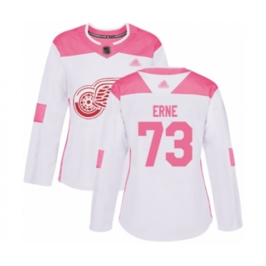 >Women's Detroit Red Wings #73 Adam Erne Authentic White Pink Fashion Hockey Jersey