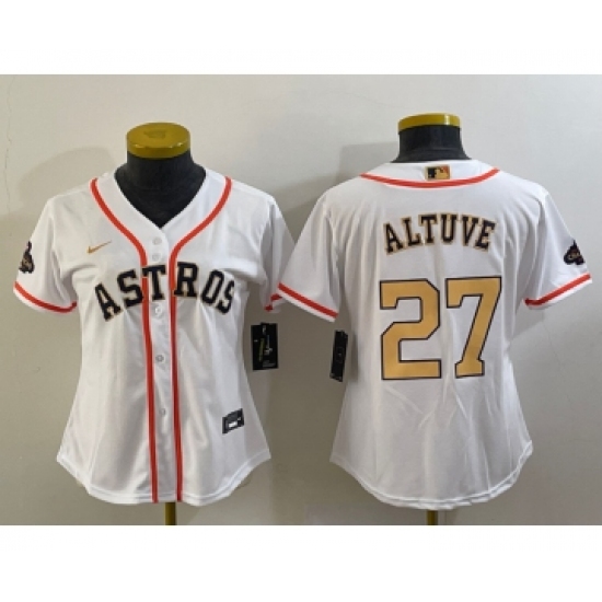 Women's Houston Astros #27 Jose Altuve 2023 White Gold World Serise Champions Cool Base Stitched Jersey