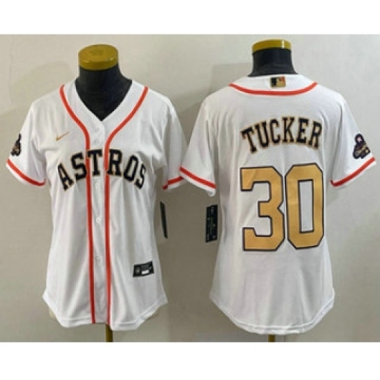 Women's Houston Astros #30 Kyle Tucker Number 2023 White Gold World Serise Champions Cool Base Stitched Jerseys