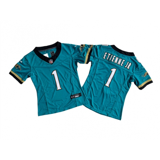 >Women's Jacksonville Jaguars #1 Travis Etienne JR Teal 2024 F.U.S.E. Prowler Throwback Vapor Limited Football Stitched Jersey(Run Small)