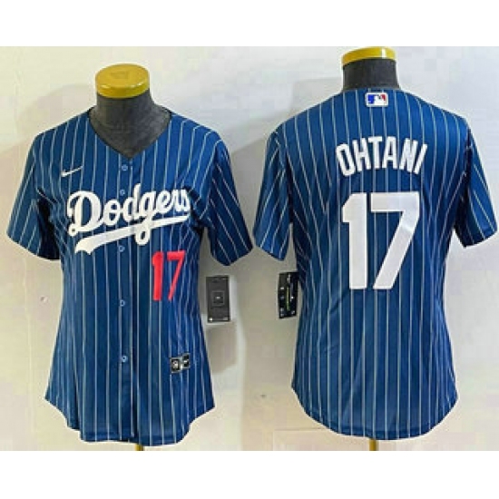 Women's Los Angeles Dodgers #17 Shohei Ohtani Number Blue Pinstripe Cool Base Stitched Baseball Jersey1