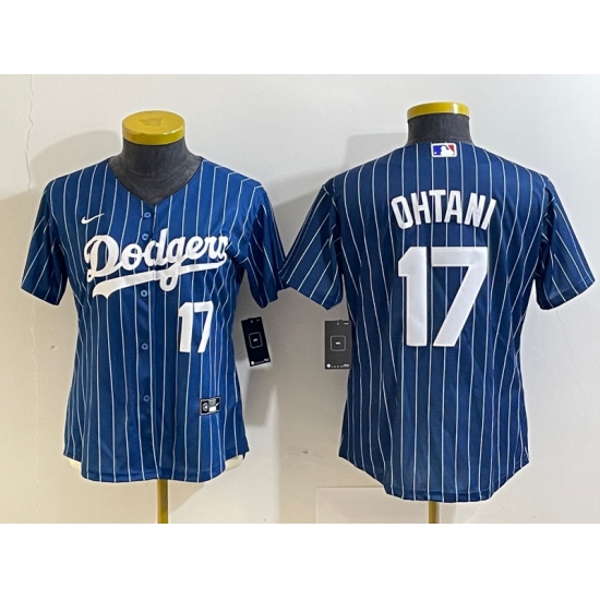 Women's Los Angeles Dodgers #17 Shohei Ohtani Number Red Navy Blue Pinstripe Stitched Cool Base Nike Jersey
