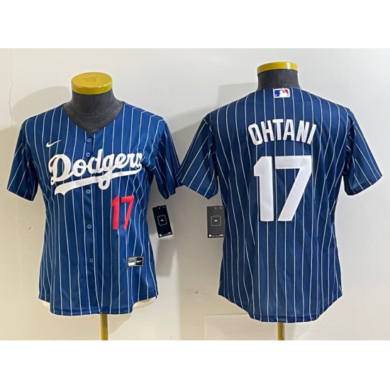 Women's Los Angeles Dodgers #17 Shohei Ohtani Number Red Navy Blue Pinstripe Stitched Cool Base Nike Jerseys