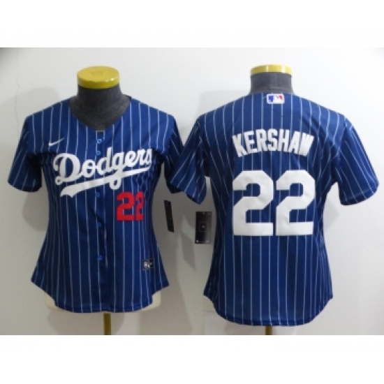 >Women's Los Angeles Dodgers #22 Clayton Kershaw Navy Blue Pinstripe Stitched MLB Cool Base Nike Jersey