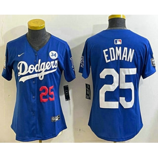 >Women's Los Angeles Dodgers #25 Tommy Edman Number Blue 2024 World Series With Fernando 34 Fashion Limited Stitched Jersey