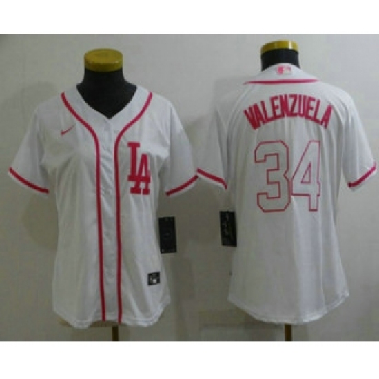 >Women's Los Angeles Dodgers #34 Fernando Valenzuela Pink White Stitched Baseball Jersey
