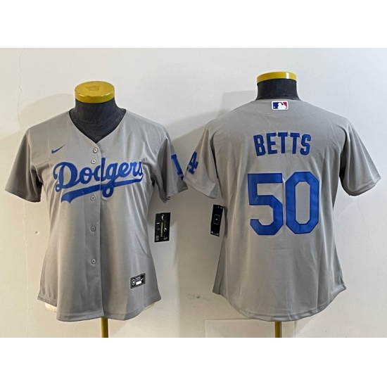 >Women's Los Angeles Dodgers #50 Mookie Betts Grey Cool Base Stitched Nike Jersey