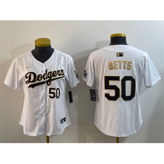 >Women's Los Angeles Dodgers #50 Mookie Betts White Gold Home Limited Stitched Baseball Jersey(Run Small)