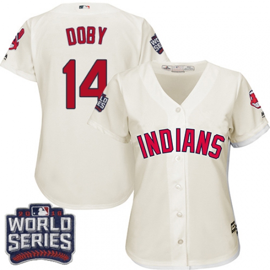 Home>MLB>Cleveland Indians>Larry Doby>Women's Majestic Cleveland Indians #14 Larry Doby Authentic Cream Alternate 2 2016 World Series Bound Cool Base MLB Jersey