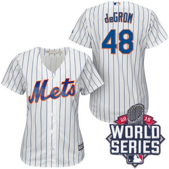 Home>MLB>New York Mets>Jacob deGrom>Women's Majestic New York Mets #48 Jacob deGrom Replica White/Blue Strip 2015 World Series MLB Jersey