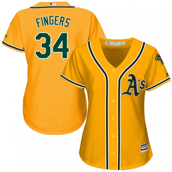 Women's Majestic Oakland Athletics #34 Rollie Fingers Replica Gold Alternate 2 Cool Base MLB Jersey