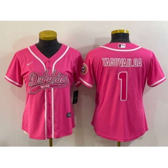 >Women's Miami Dolphins #1 Tua Tagovailoa Pink With Patch Cool Base Stitched Baseball Jersey