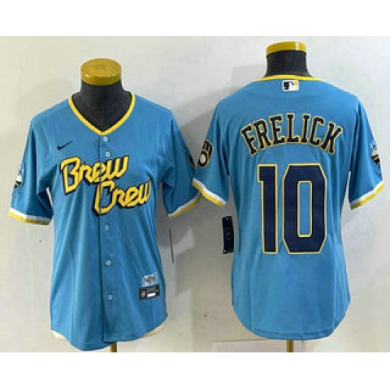 >Women's Milwaukee Brewers #10 Sal Frelick Blue 2022 City Connect Cool Base Stitched Jersey