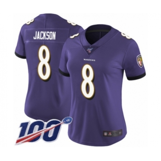 Women's Nike Baltimore Ravens #8 Lamar Jackson Purple Team Color Vapor Untouchable Limited Player 100th Season NFL Jersey