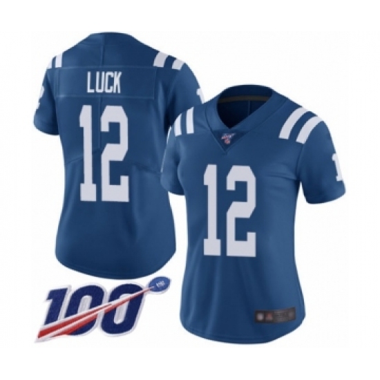 >Women's Nike Indianapolis Colts #12 Andrew Luck Royal Blue Team Color Vapor Untouchable Limited Player 100th Season NFL Jersey