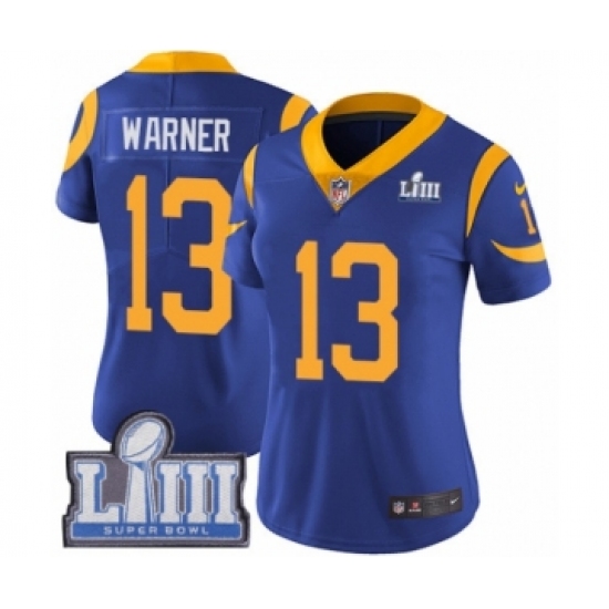 >Women's Nike Los Angeles Rams #13 Kurt Warner Royal Blue Alternate Vapor Untouchable Limited Player Super Bowl LIII Bound NFL Jersey