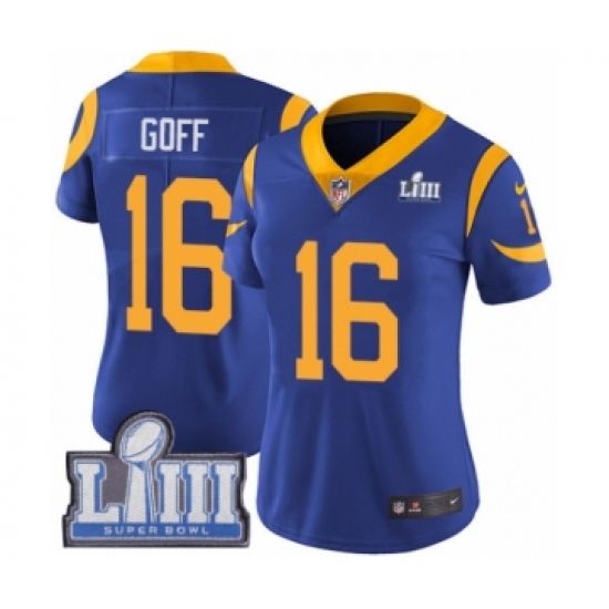 >Women's Nike Los Angeles Rams #16 Jared Goff Royal Blue Alternate Vapor Untouchable Limited Player Super Bowl LIII Bound NFL Jersey