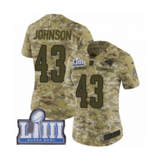 >Women's Nike Los Angeles Rams #43 John Johnson Limited Camo 2018 Salute to Service Super Bowl LIII Bound NFL Jersey