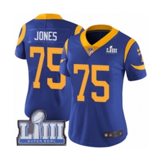 >Women's Nike Los Angeles Rams #75 Deacon Jones Royal Blue Alternate Vapor Untouchable Limited Player Super Bowl LIII Bound NFL Jersey