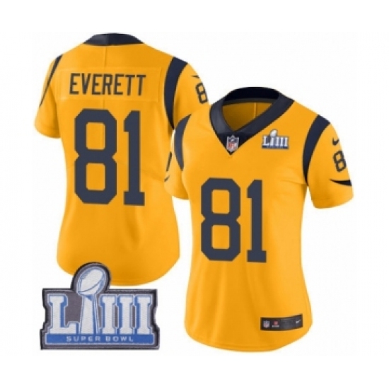 >Women's Nike Los Angeles Rams #81 Gerald Everett Limited Gold Rush Vapor Untouchable Super Bowl LIII Bound NFL Jersey
