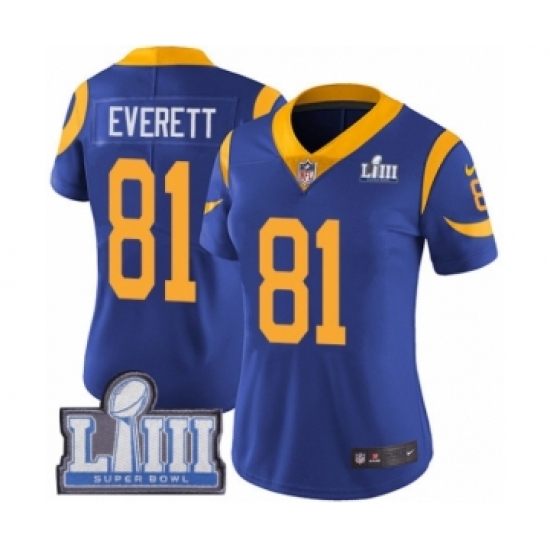 >Women's Nike Los Angeles Rams #81 Gerald Everett Royal Blue Alternate Vapor Untouchable Limited Player Super Bowl LIII Bound NFL Jersey