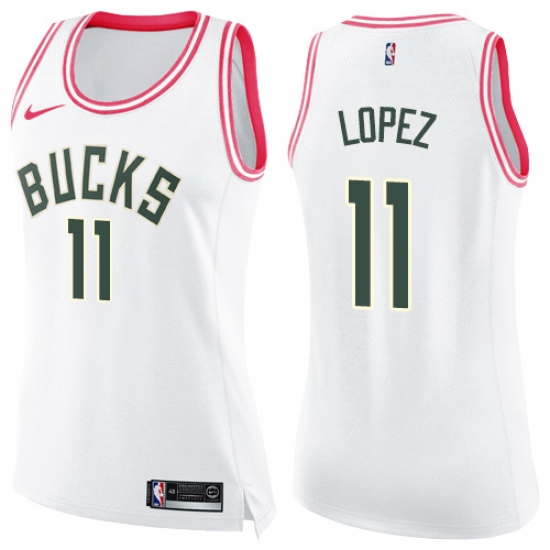 >Women's Nike Milwaukee Bucks #11 Brook Lopez Swingman White Pink Fashion NBA Jersey