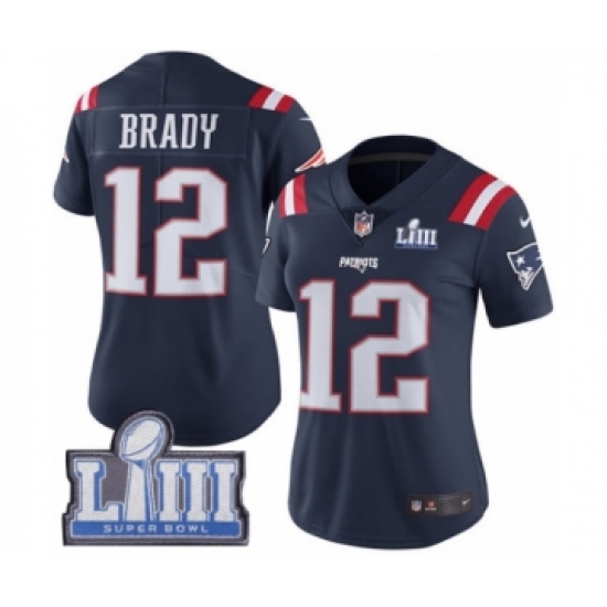 >Women's Nike New England Patriots #12 Tom Brady Limited Navy Blue Rush Vapor Untouchable Super Bowl LIII Bound NFL Jersey