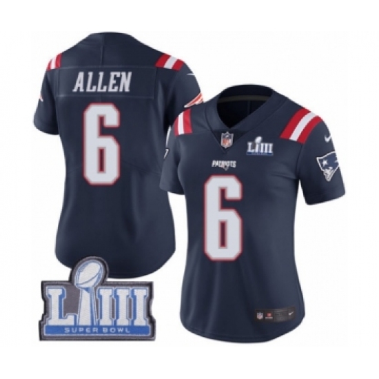 >Women's Nike New England Patriots #6 Ryan Allen Limited Navy Blue Rush Vapor Untouchable Super Bowl LIII Bound NFL Jersey