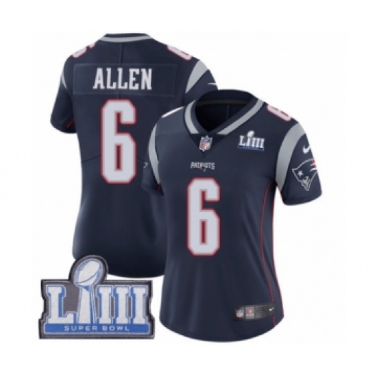 >Women's Nike New England Patriots #6 Ryan Allen Navy Blue Team Color Vapor Untouchable Limited Player Super Bowl LIII Bound NFL Jersey
