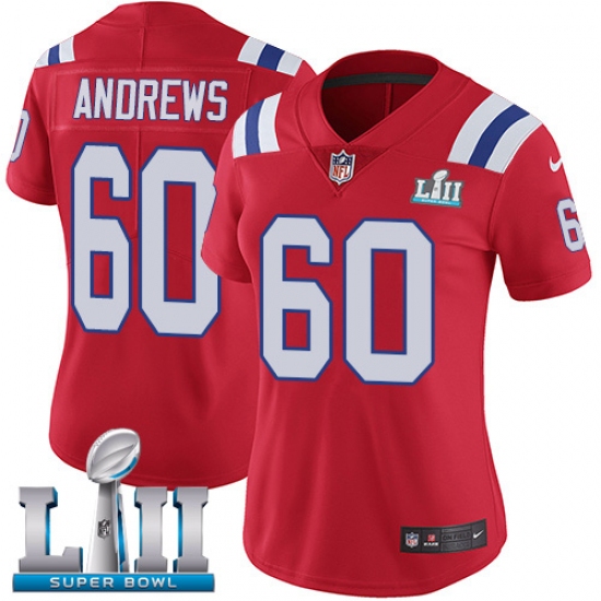 Home>NFL>New England Patriots>David Andrews>Women's Nike New England Patriots #60 David Andrews Red Alternate Vapor Untouchable Limited Player Super Bowl LII NFL Jersey