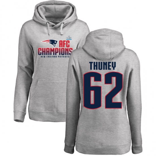 >Women's Nike New England Patriots #62 Joe Thuney Heather Gray 2017 AFC Champions Pullover Hoodie