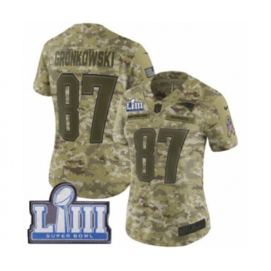 >Women's Nike New England Patriots #87 Rob Gronkowski Limited Camo 2018 Salute to Service Super Bowl LIII Bound NFL Jersey
