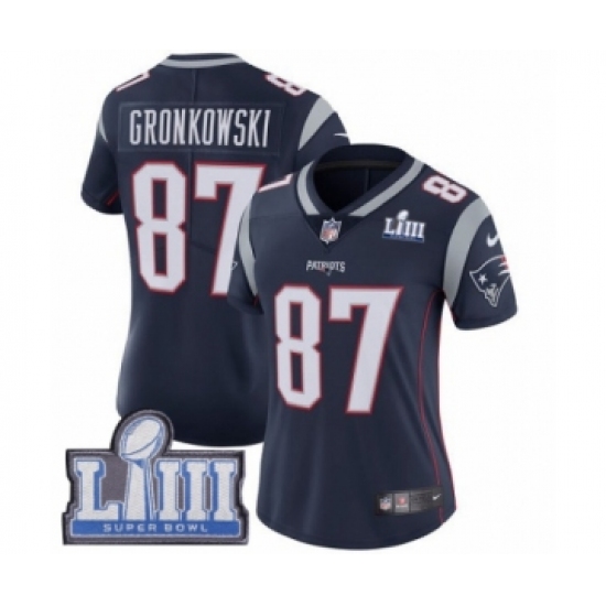 >Women's Nike New England Patriots #87 Rob Gronkowski Navy Blue Team Color Vapor Untouchable Limited Player Super Bowl LIII Bound NFL Jersey