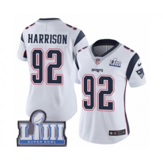 Women's Nike New England Patriots #92 James Harrison White Vapor Untouchable Limited Player Super Bowl LIII Bound NFL Jersey
