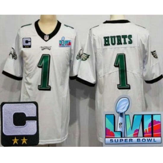 Women's Philadelphia Eagles #1 Jalen Hurts Limited White C Patch Super Bowl LVII Vapor Jersey