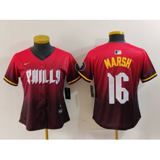 >Women's Philadelphia Phillies #16 Brandon Marsh Red 2024 City Connect Limited Jersey