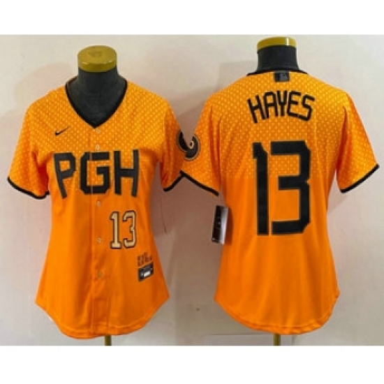 >Women's Pittsburgh Pirates #13 KeBryan Hayes Number Yellow 2023 City Connect Stitched Jersey