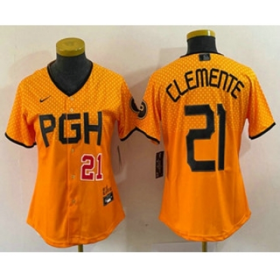 >Women's Pittsburgh Pirates #21 Roberto Clemente Number Yellow 2023 City Connect Stitched Jersey1