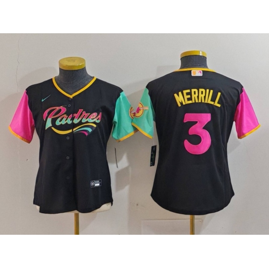 >Women's San Diego Padres #3 Jackson Merrill Black Fashion Baseball Jersey