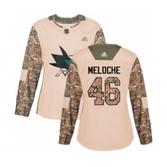 >Women's San Jose Sharks #46 Nicolas Meloche Authentic Camo Veterans Day Practice Hockey Jersey