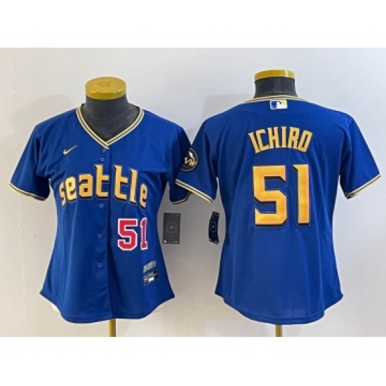 Women's Seattle Mariners #51 Ichiro Suzuki Number Blue 2023 City Connect Cool Base Stitched Jersey1