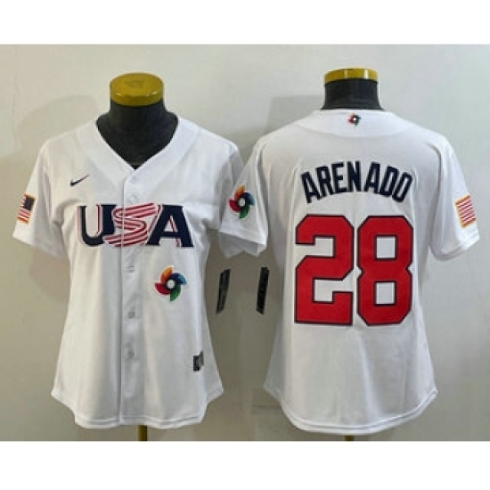 >Women's USA Baseball #28 Nolan Arenado 2023 White World Classic Replica Stitched Jersey