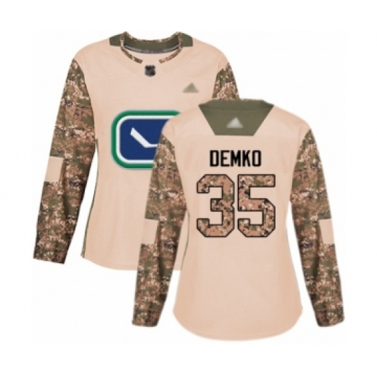 >Women's Vancouver Canucks #35 Thatcher Demko Authentic Camo Veterans Day Practice Hockey Jersey