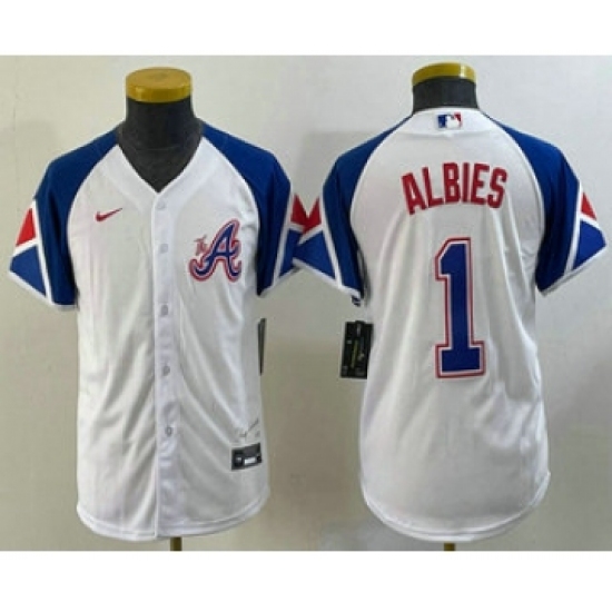 Youth Atlanta Braves #1 Ozzie Albies White 2023 City Connect Cool Base Stitched Jersey